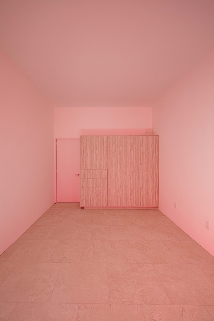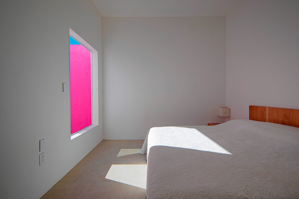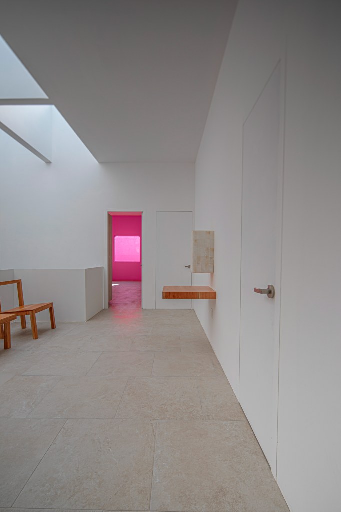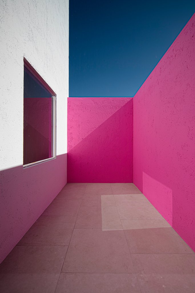 Casa 13O, siete metros de frente, el terreno común de mi país México, pequeño para la mayoría, nuevamente el muro sin ventanas hace la fachada, En esta casa encuentras la paz que todos buscan, cada espacio crea ilusiones. No invento nada, solo descubrí. La Arquitectura se dibuja con poesía, las líneas son secundarias. Con sus tres patios vive la casa, uno de ellos, muy especial por su color rosa, pues el color es para quien lo encuentra. En la habitación rosa se ve la silla mexicana en acero y tela que parece que vuela el asiento.